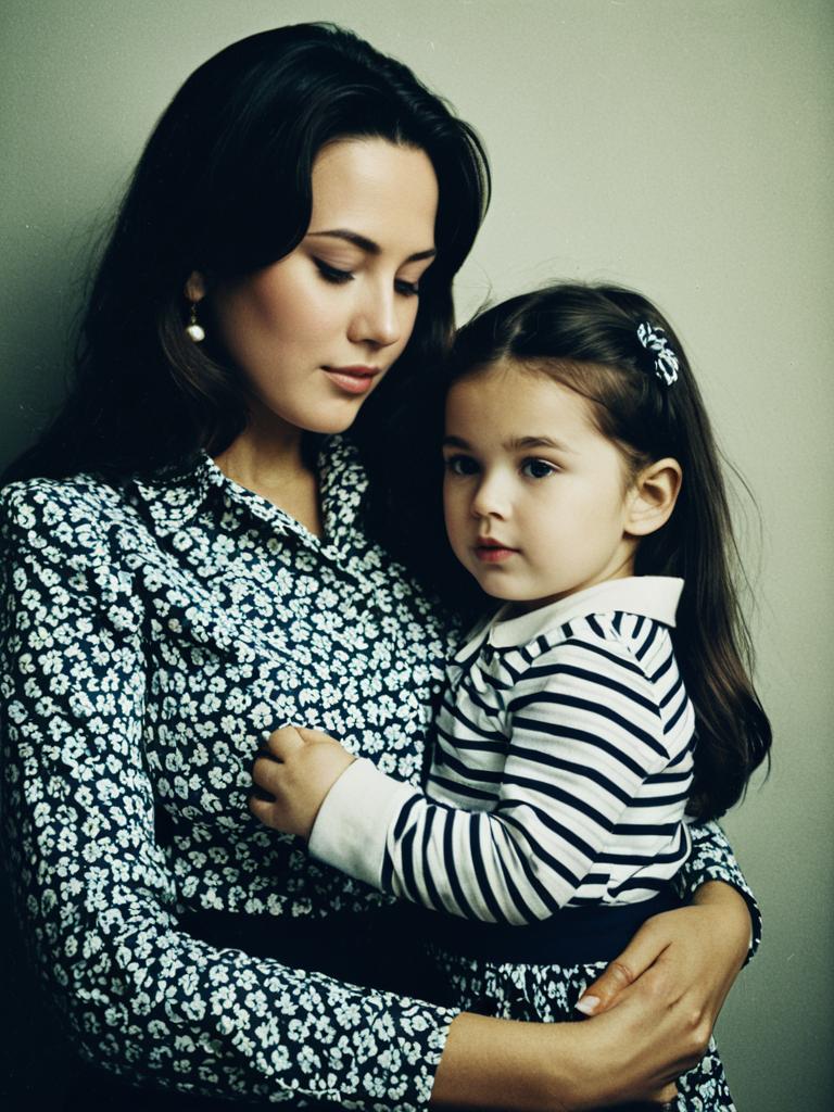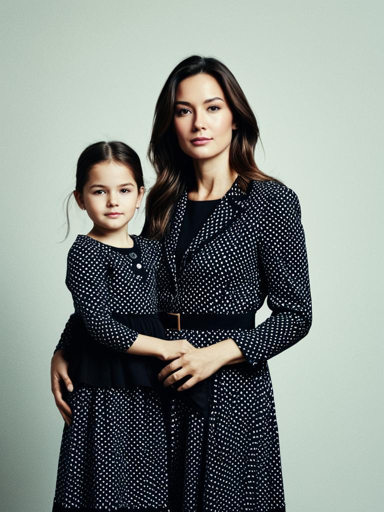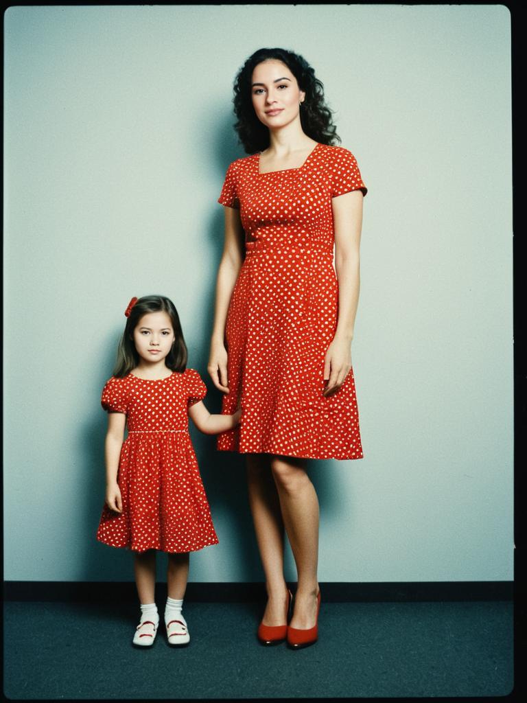 Woman with Daughter in Matching Outfit, full-body photo in coordinated dresses