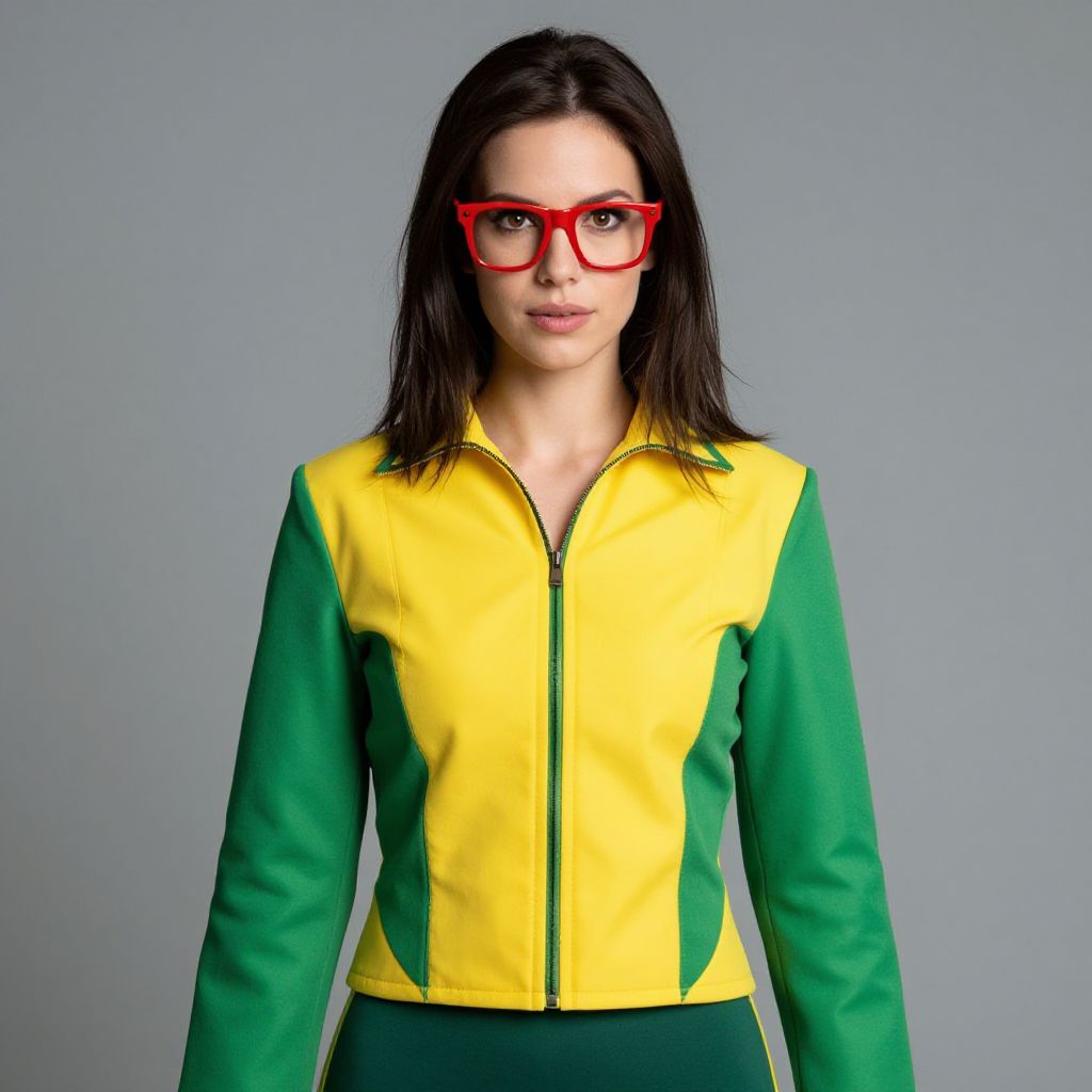 "Zoolander Female Costume, woman wearing a yellow and green jacket and red glasses"