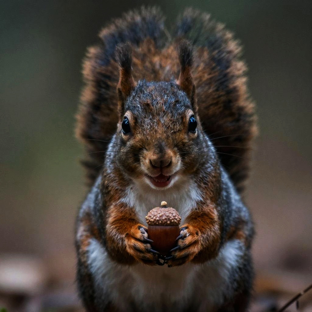 Blurry, award winning wildlife, squirrel, holding a acorn nut, smiling, close up photo, detailed furry hair, at the forest, facing viewer(medium long shot:1.4), 35mm film movie still, ultra photorealistic, photorealism, taken with hasselblad H6D 100c, the HCD 24mm lens, hazy mood, cinematic dramatic lighting, cold muted colors, (DOF:1.4), sharp focus, (perfect real extremely details), amazing fine detail, absurdres, hyper realistic lifelike texture, dramatic lighting