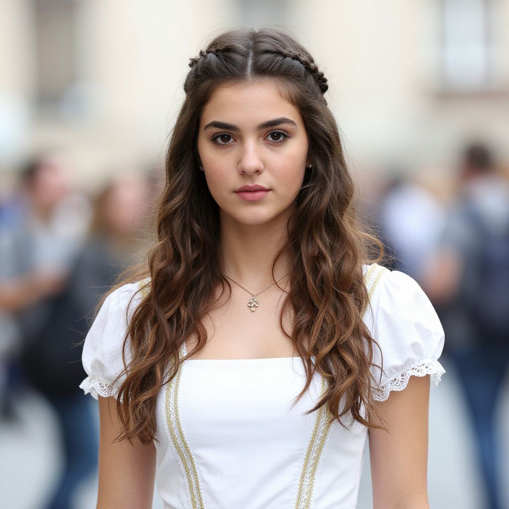 Photograph of a young woman with light olive skin and dark brown hair styled in two long braids. She has dark, defined eyebrows and wears subtle makeup with light pink lipstick. She is dressed in a plain, long-sleeved white top. Her hands are clasped together near her chest, with a gentle, slightly confident expression on her face. The background is blurred, showing indistinct figures and a mix of gray and white colors, suggesting an outdoor urban setting. The overall image has a sharp focus on the woman, with a shallow depth of field highlighting her against the blurred background.