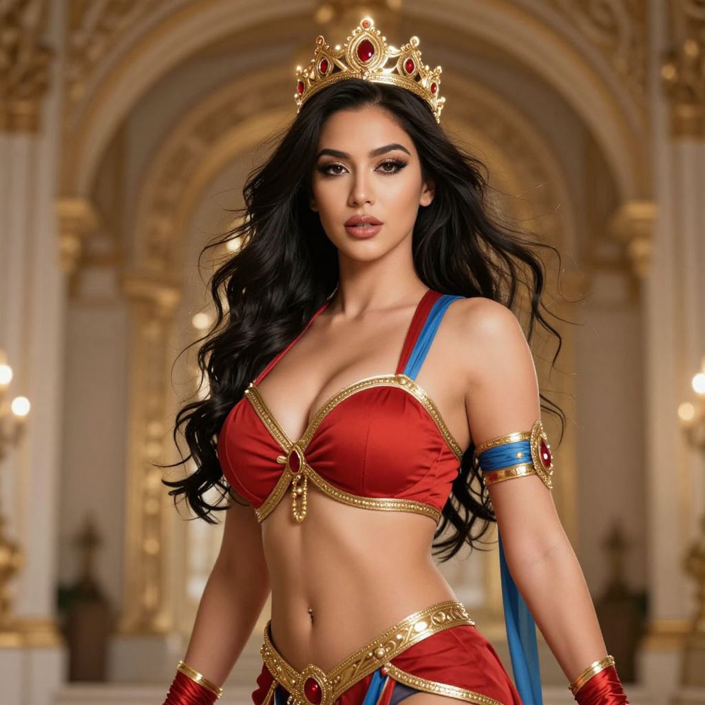 A beautiful woman with long flowing hair and a sensual, confident posture is wearing a traditional red and blue outfit with gold accents, her vibrant attire highlighting her elegant and powerful presence. She has a majestic crown on her head, glowing with subtle golden light, and is posing for a photo with a striking, glamorous expression. Her large, full breasts accentuate her curves, and her sexy, confident demeanor exudes charisma and authority. The background is a rich, ornate palace with soft golden light filtering through arches, creating a regal and cinematic atmosphere.
