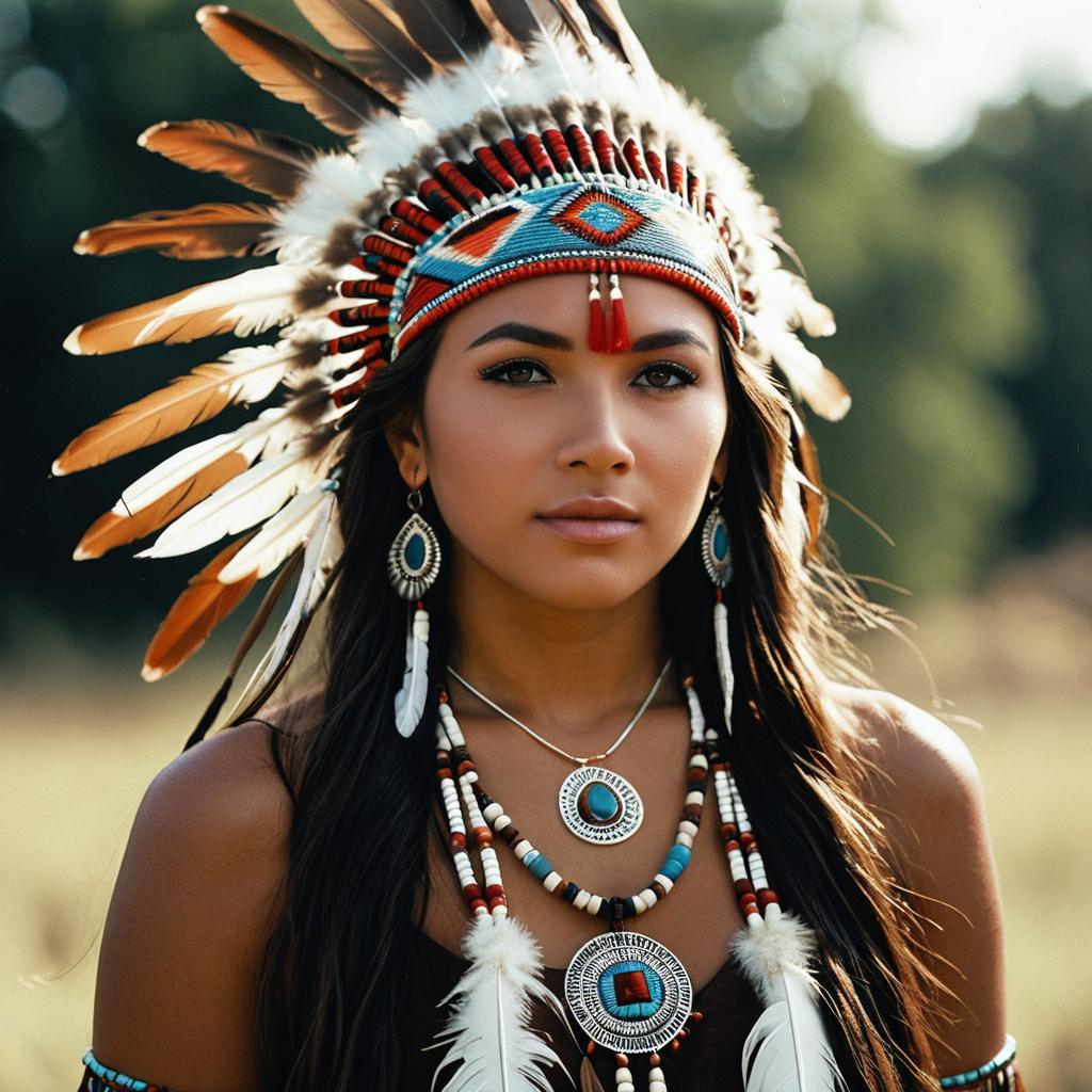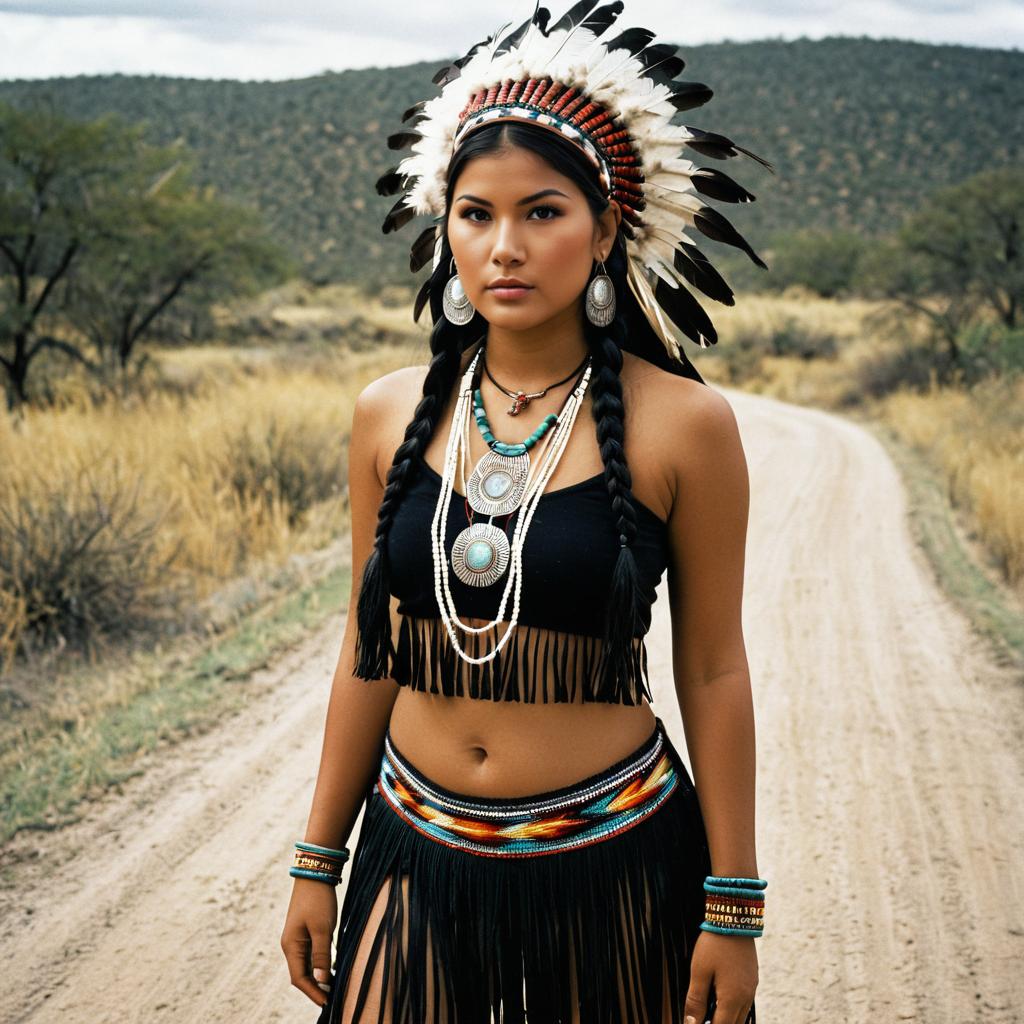 Portrait of a Native American woman standing on a rural dirt road wearing a black fringed crop top, traditional feathered headdress, and colorful beadwork necklaces and bracelets. She has long black braided hair and silver jewelry, with a natural outdoor landscape background featuring desert vegetation and hills.