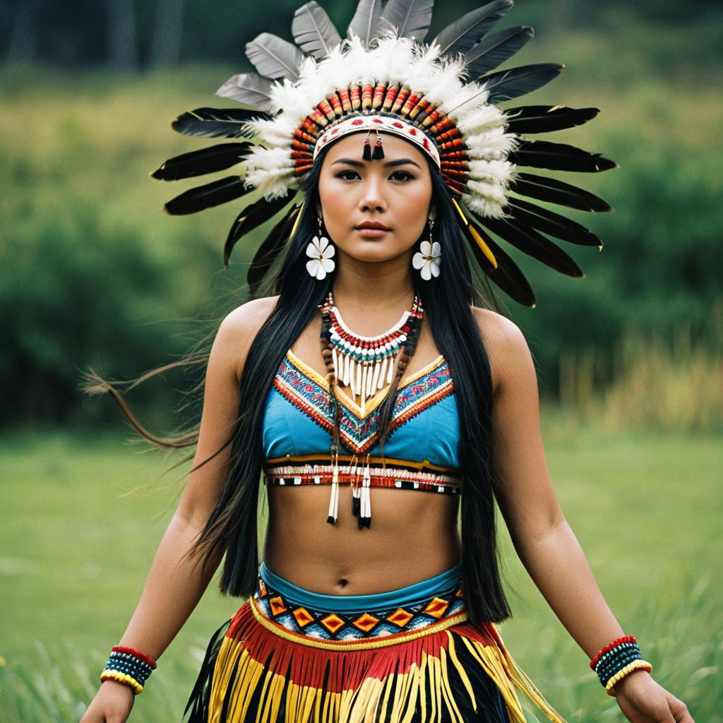 Chel road dorado costume,1girl, solo, native american, jewelry, braid, midriff, realistic, black hair, headdress, outdoors, looking at viewer, necklace, crop top, fringe trim, standing