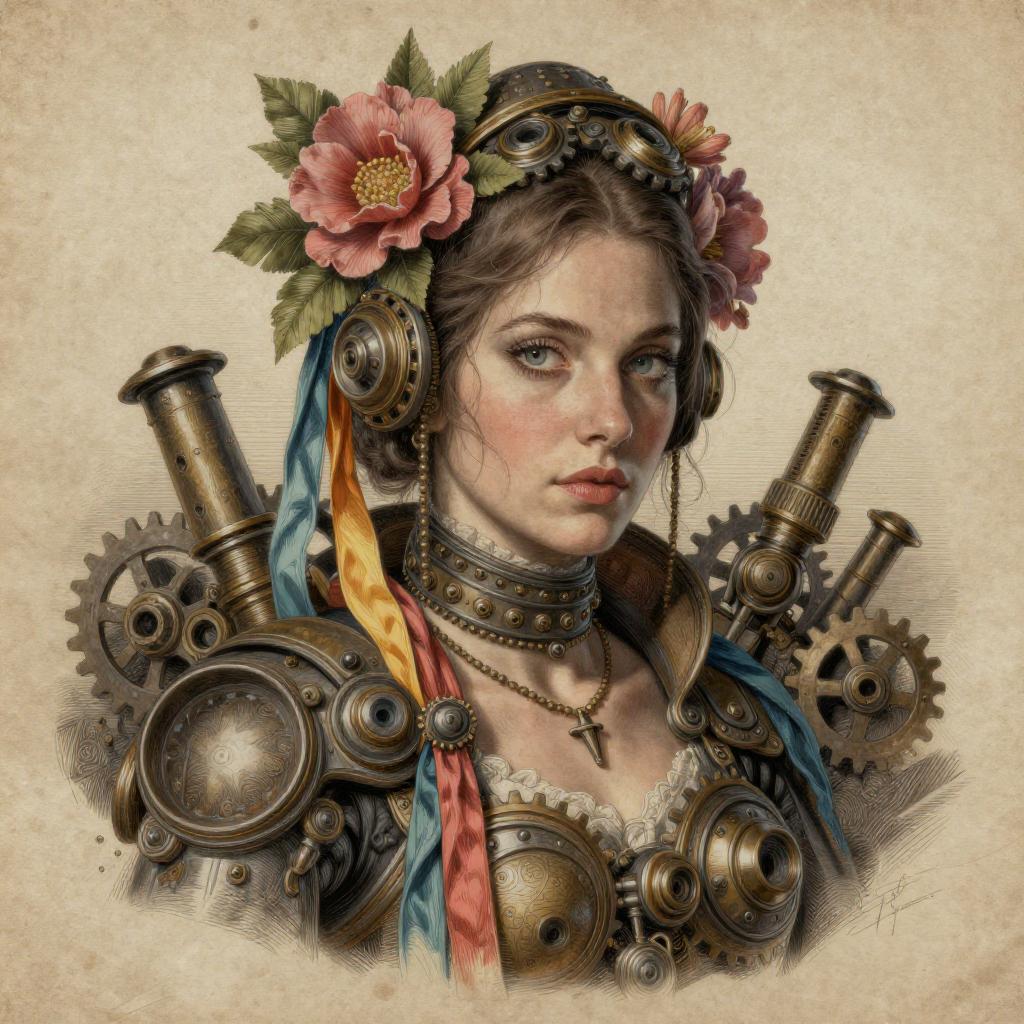 Snthwve style nvinkpunk Charlie Bowater realistic Lithography sketch portrait of a woman, flowers, [gears], pipes, dieselpunk, multi-colored ribbons, old paper texture, highly detailed