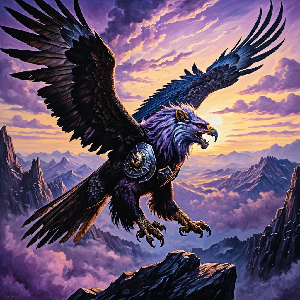 Oil painting of a majestic griffon with a lion's body and an eagle's head, depicted in royal purple and silver tones. The griffon is soaring over a dramatic mountainous landscape under a soft twilight glow, surrounded by other flying birds. The artwork features a rich and textured style inspired by Warhammer fantasy RPG.
