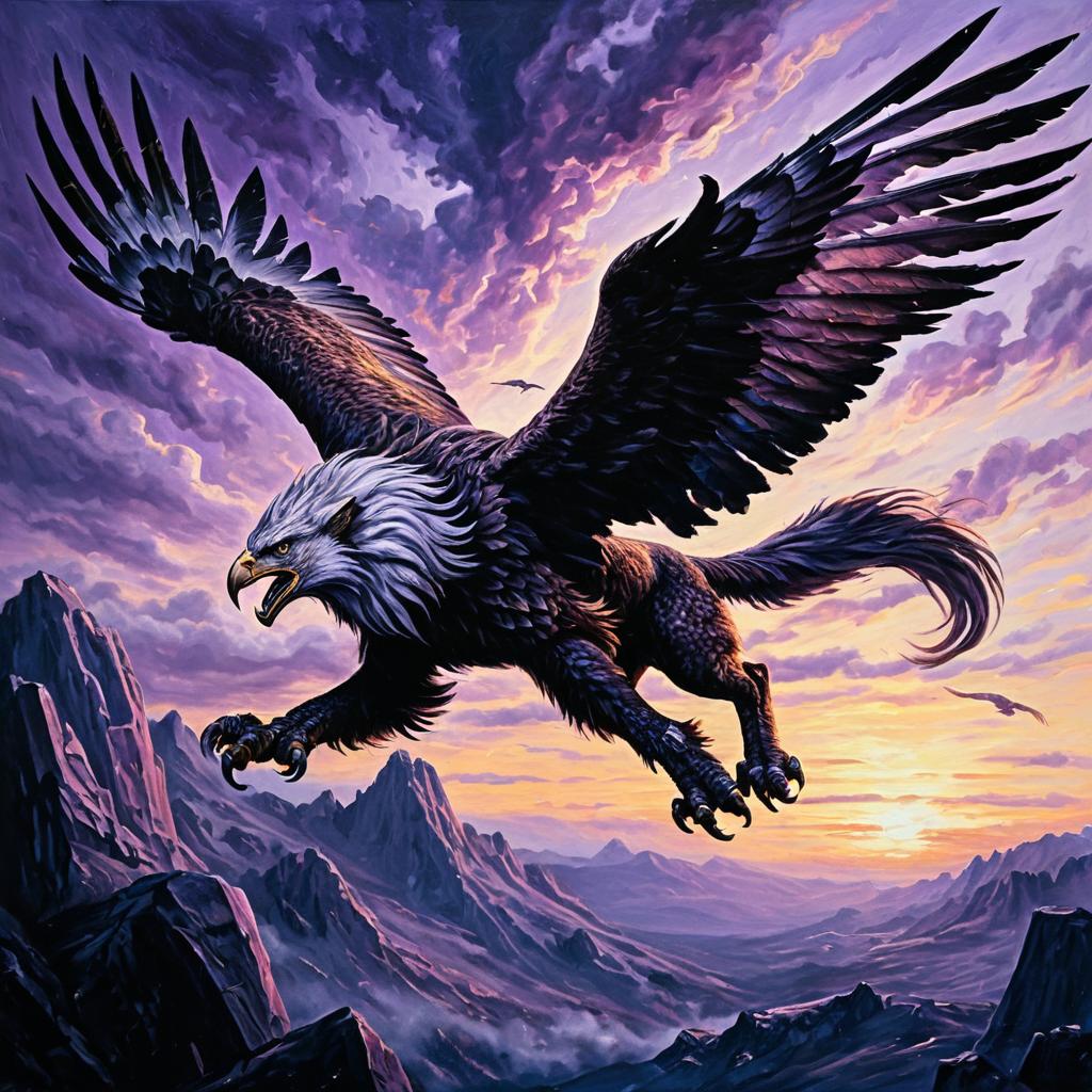 Warhammer fantasy RPG style oil painting of majestic griffon flying in sky, lion body with eagle head, royal purple and silver tones, soft twilight glow, rich and textured oil painting