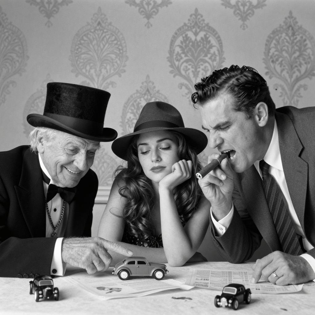 Black and white photo featuring an elderly man wearing a top hat and chain necklace, smiling and pointing at a toy car on the table. A young woman in a dark hat sits in the middle, resting her head on her hand with closed eyes. A man in a suit on the right is holding a cigar and appears to be yelling aggressively. The table has toy cars, papers, and various objects, with an ornate wallpaper background.