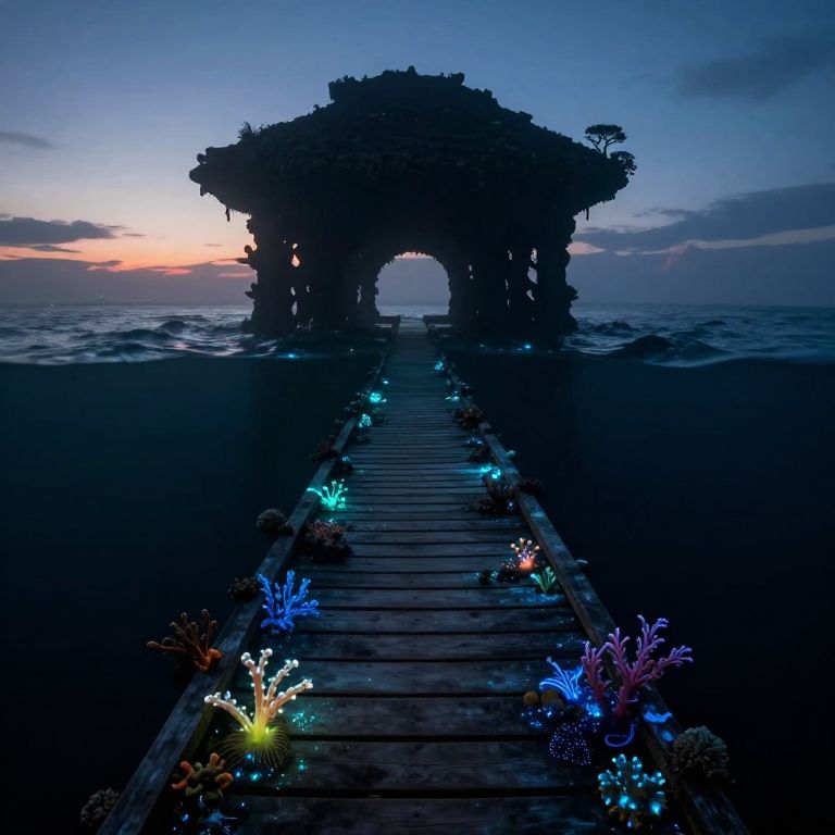 A tranquil yet enigmatic underwater scene unfolds with an idyllic wooden pier stretching into an inky black abyss, bathed in ethereal light from bioluminescent flora and fauna adorning its surface. The silhouette of a colossal, ancient structure emerges through the translucent waves, enveloping viewers in a mysterious beauty. As daylight softly transitions to twilight, this dreamlike setting evokes a spectrum of emotions ranging from serene tranquility to piqued curiosity, inviting exploration into the depths of an captivating otherworldly realm.