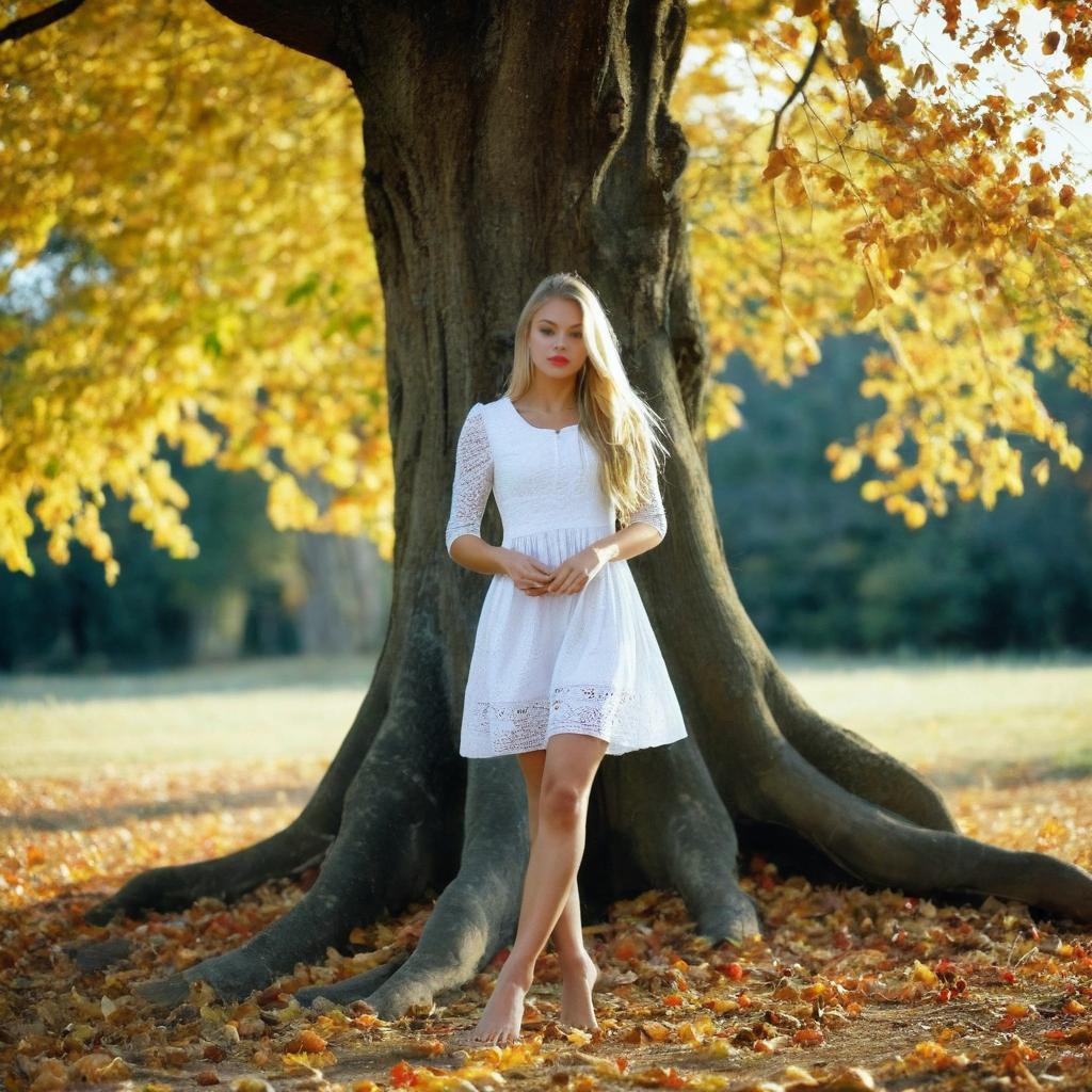 1girl, solo, barefoot, blonde hair, long hair, dress, realistic, tree, lips, outdoors, photorealistic, feet, autumn, blurry