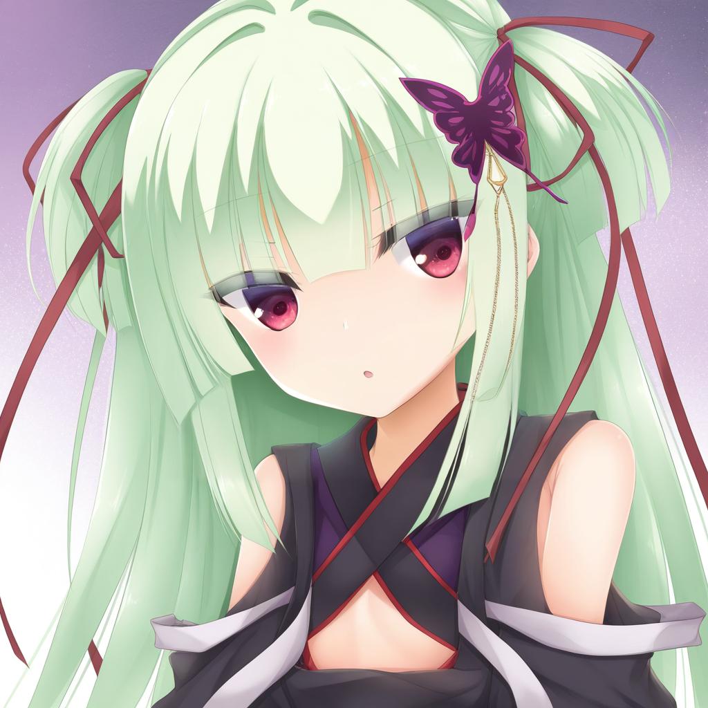 This digital anime-style drawing features a young girl with long, mint-green hair adorned with a purple butterfly hairclip and red ribbons. She has large, pink-red eyes and a slightly blushing, serious expression. Her outfit is a black, sleeveless top with white trim and red crisscrossing lines over her chest. The background is a gradient of purple and white, giving a soft, ethereal feel. The artwork has a glossy, high-contrast finish typical of modern digital anime illustrations.