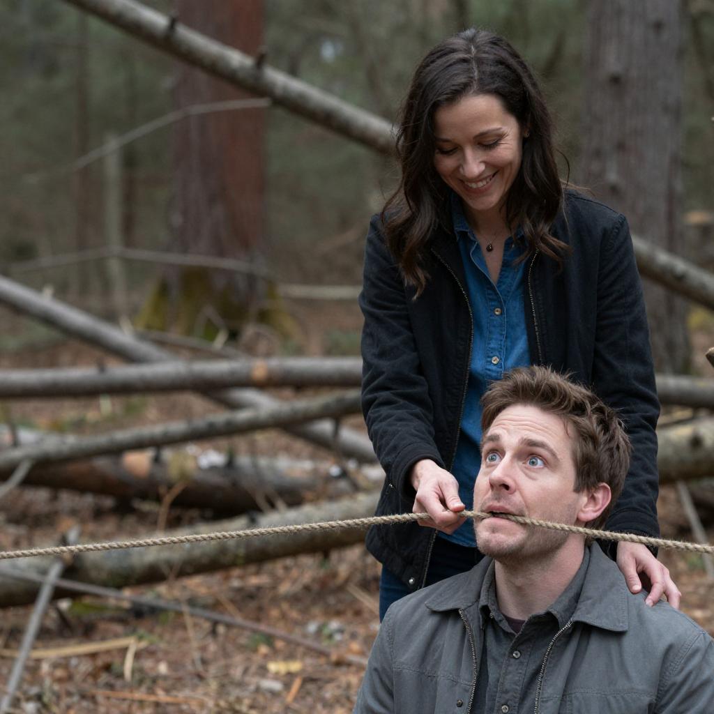 Photograph of two people in a forest. Woman with dark hair, wearing black jacket and blue shirt, pulls thin rope tied to man's mouth. Man with brown hair, wearing gray jacket, looks surprised. Fallen branches and trees in background. Woman smiles.