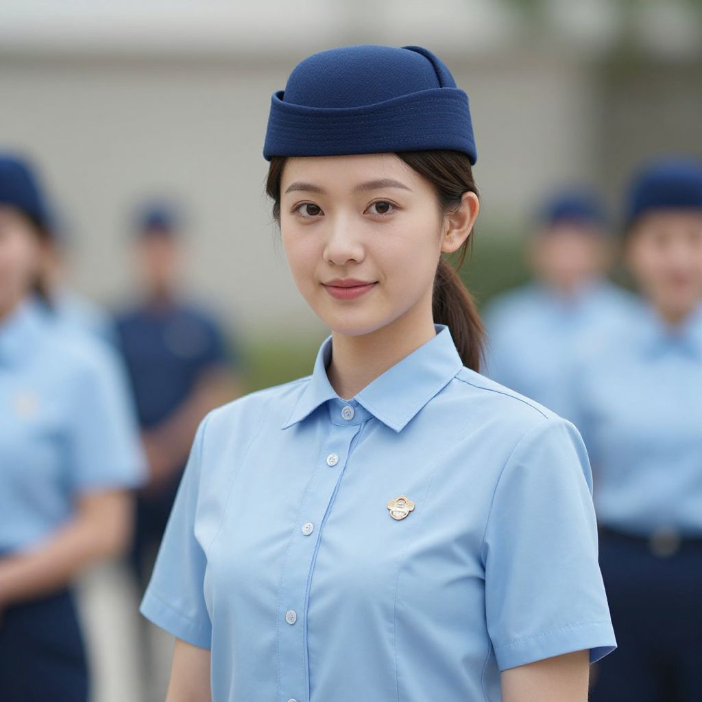 Modern woman work clothes, 1girl, solo, uniform, realistic, shirt, blurry background, hat, blurry, looking at viewer, blue headwear, brown hair, collared shirt, upper body, asian, smile