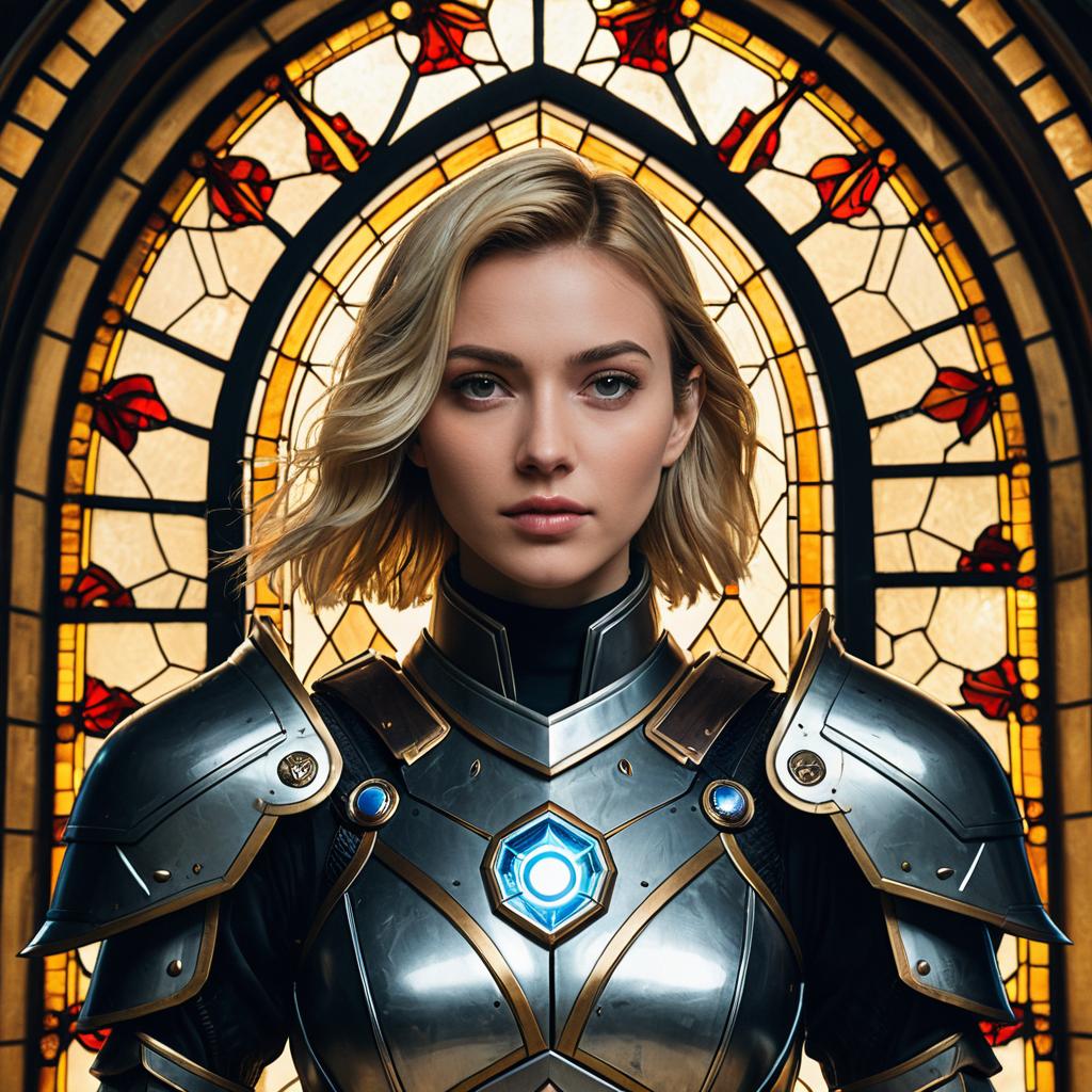 Highly detailed portrait of a hopeful young female astronaut with wavy blonde hair, wearing a reflective golden spacesuit with metallic shoulder armor. The background features a dark, futuristic nightclub-inspired setting with subtle space nebula lighting elements. The image blends cyberpunk and sci-fi aesthetics in vibrant yet slightly muted gold, silver, and black tones.