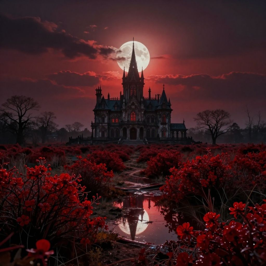 A digital artwork depicting a gothic-style castle silhouetted against a vivid red moon in a dark, cloudy sky. The castle, with tall spires and intricate architecture, stands prominently in the background. In the foreground, a reflective, narrow stream winds through a field of bright red flowers, mirroring the moon's glow. Bare trees flank the scene, adding to the eerie, mystical atmosphere. The overall color palette is dominated by deep reds, blacks, and purples, enhancing the haunting, magical quality of the landscape.