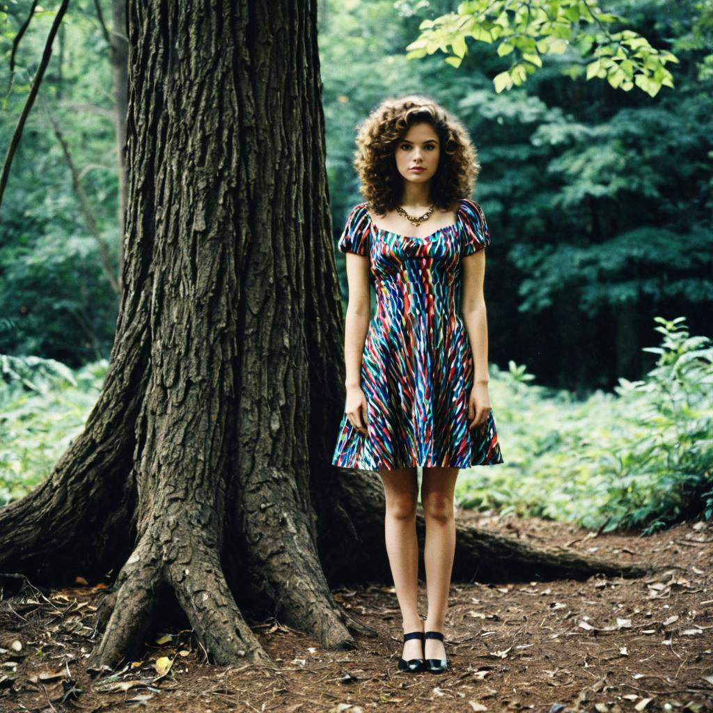 A young blonde woman with long curly hair stands outdoors in front of a tree, wearing a multicolored, patterned dress. She is looking directly at the camera with a neutral expression, surrounded by green foliage and a grassy area.