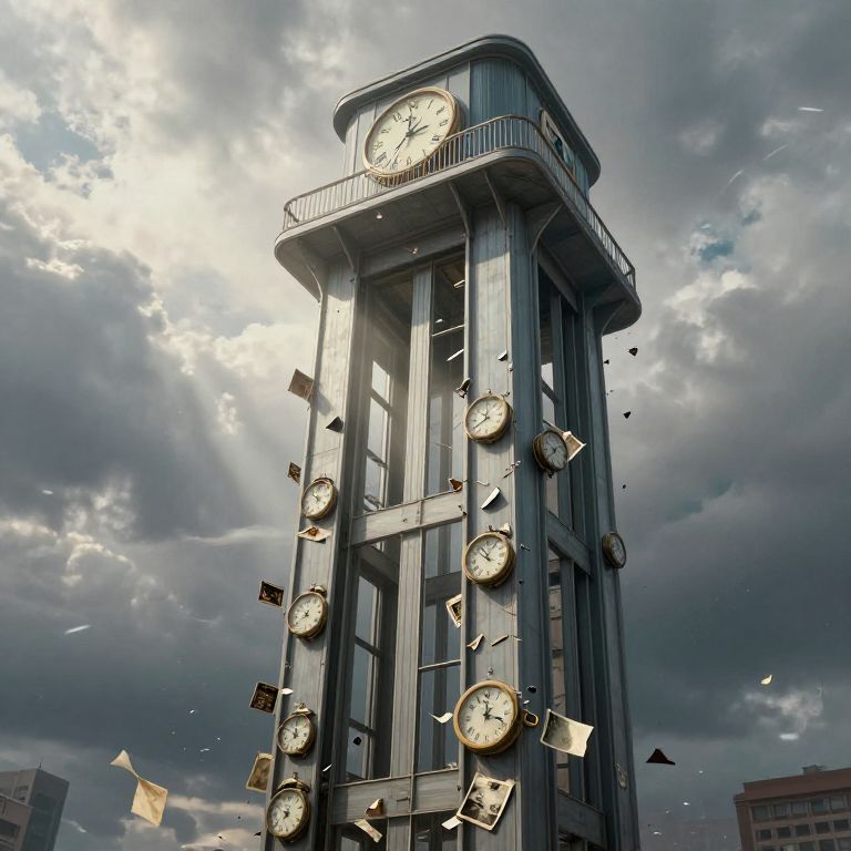 Photograph of a futuristic, tall clock tower with multiple clocks on its sides, under a dramatic, cloudy sky, with flying papers and flags.