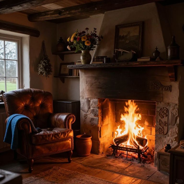 The image depicts a cozy, rustic interior of an old cottage at nighttime. A large, open fire burns brightly in the fireplace, casting a warm glow that illuminates the room. The flames flicker and dance, creating a sense of warmth and comfort. To the left of the fireplace, a comfortable antique leather chair is positioned, draped with a blue blanket that adds a touch of softness to the scene. The chair is placed near a window, allowing natural light to filter in during the day. Above the chair, a vase filled with dried herbs hangs, adding a rustic charm to the room. On the mantle, a bouquet of flowers in a vase sits, their colors contrasting beautifully with the dark surroundings. The walls are adorned with various items, including books and decorative objects, creating a lived-in and inviting atmosphere. The overall composition is balanced, with the fireplace and chair as the central focal points, surrounded by the warm, inviting light. The scene is captured with a Canon wide-angle lens, enhancing the sense of depth and perspective. The artistry of the image is evident in the attention to detail, from the textures of the leather chair to the intricate patterns on the fireplace mantle.