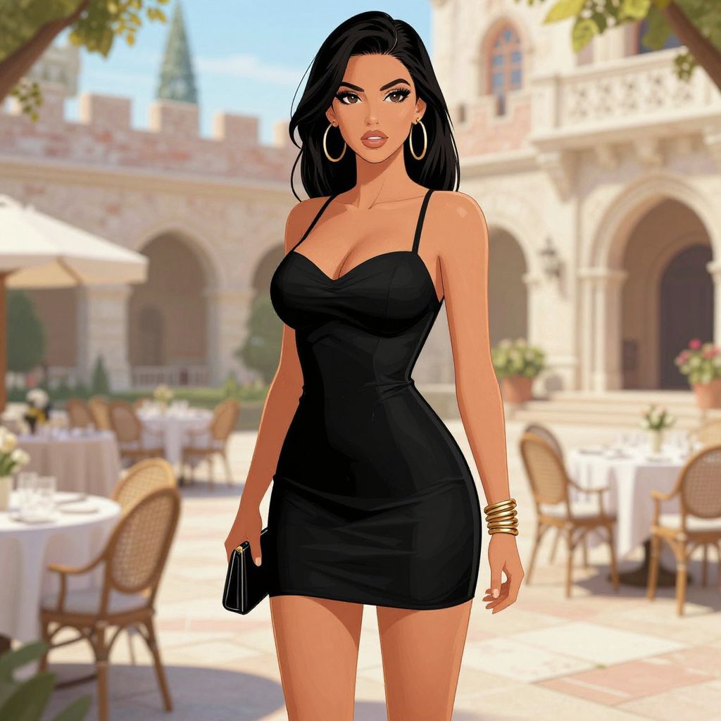 A Slim woman, in a sleek black mini dress with thin straps and strappy stiletto heels, carrying a small black clutch, adorned with a gold bangle bracelet and large hoop earrings, set against the backdrop of a castle courtyard with outdoor dining, illustrated in a vibrant image comics style. Sexy. Pretty face and beutiful eyes Sexy. Pretty face and beаutiful eyes. Big breasts