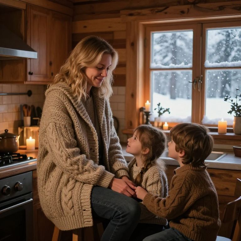 A cozy family of three sits in a rustic cabin kitchen during winter, the mother with soft blonde hair and a kind smile is wearing a textured wool outerwear coat with a woolen cable knit pattern, the room lit by candlelight with snow softly falling outside the window, the coat showing visible texture and warmth in the dim glow.