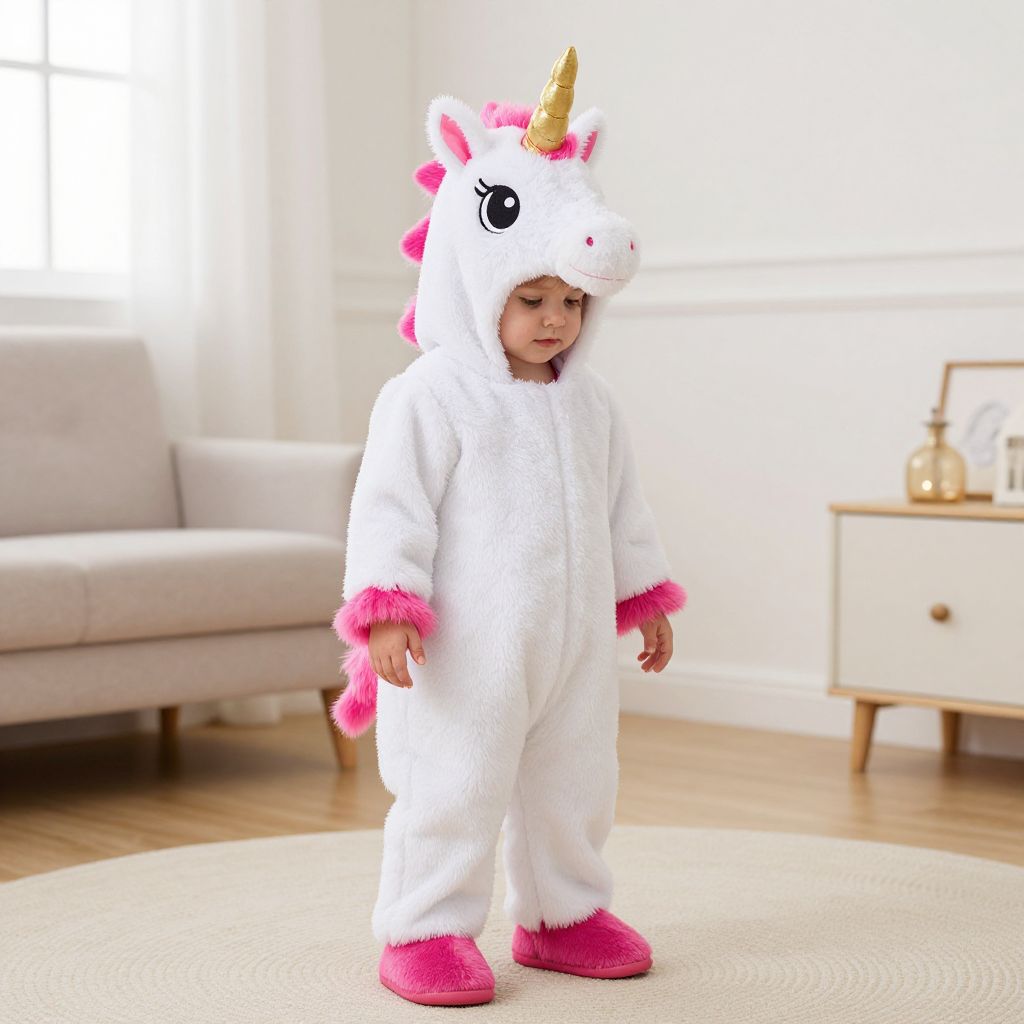 Photograph of a young child in a white unicorn onesie with pink accents, standing in a bright, modern living room.