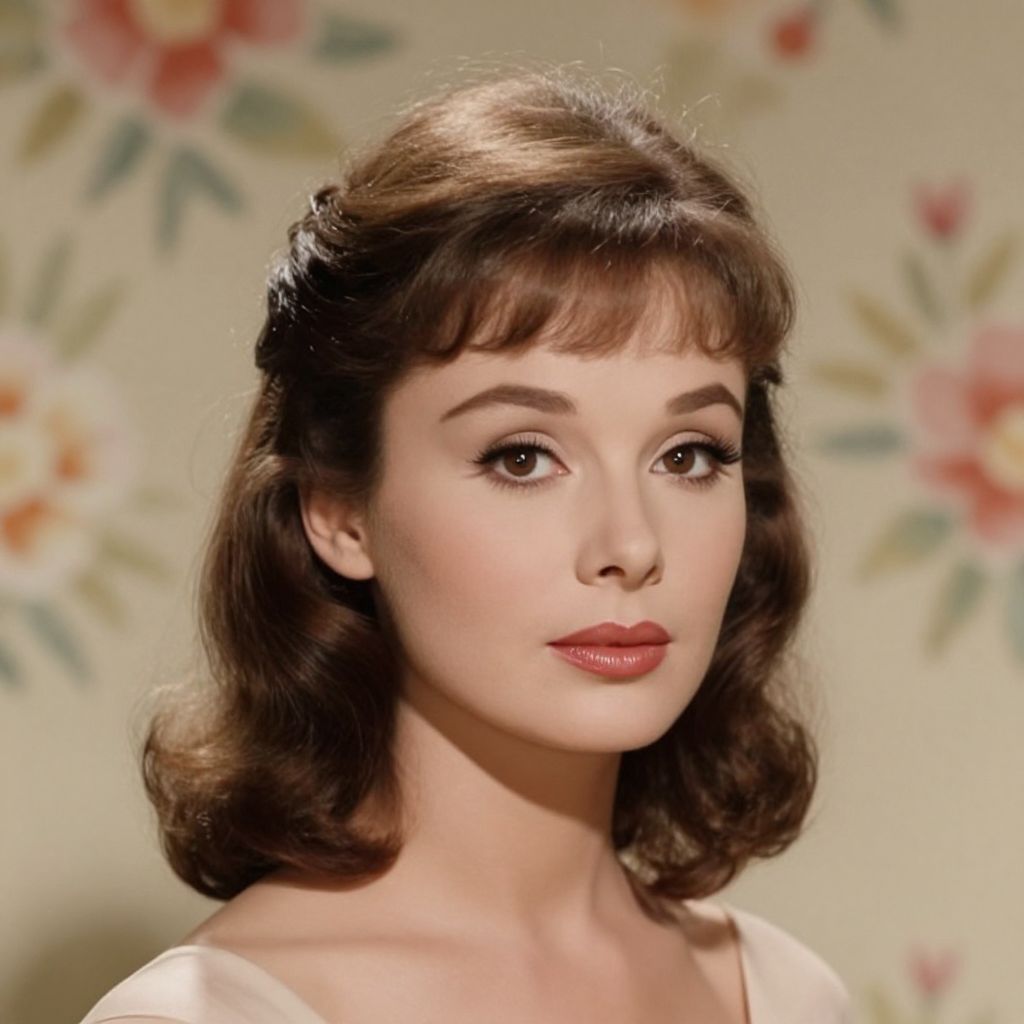 A high-definition digital art portrait featuring a woman with vintage-inspired styling, reminiscent of Catherine Deneuve, rendered in a classic, elegant style with soft lighting and a floral backdrop, evoking a timeless, retro aesthetic.