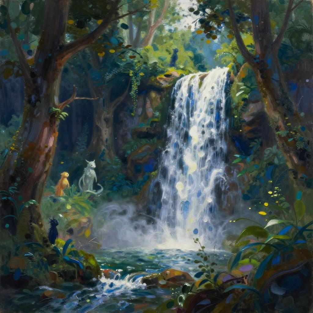 Have AI draw a picture of a serene forest scene with AI-generated mythical creatures peeking through ancient trees, soft dappled sunlight filtering down, and a sparkling river flowing gently, blending fantasy and nature in a painterly style.