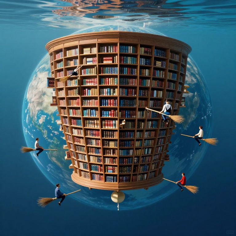 An upside-down library floats beneath the Earth’s surface, where gravity-inverted librarians fly on brooms between floating bookshelves.