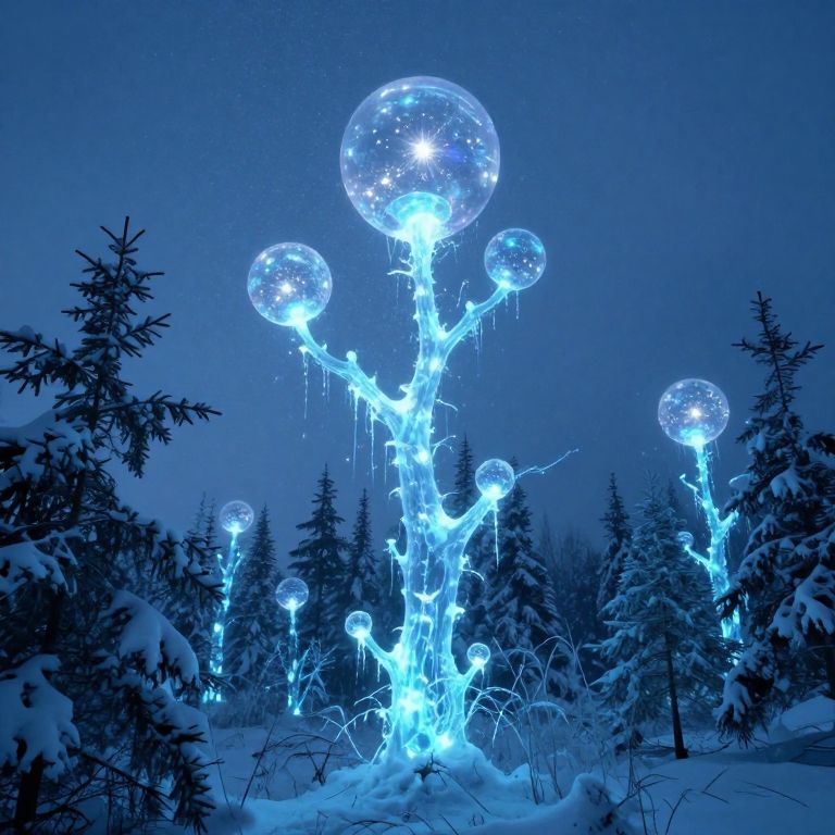 Beneath an ice-covered sky, bioluminescent trees grow upward into the frigid void, cradling floating orbs of liquid starlight like stolen dreams.