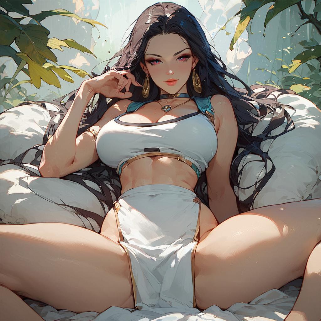 Digital artwork of a sexy, dark-haired woman with large breasts, wearing a white crop top and skirt, lounging seductively on white pillows,