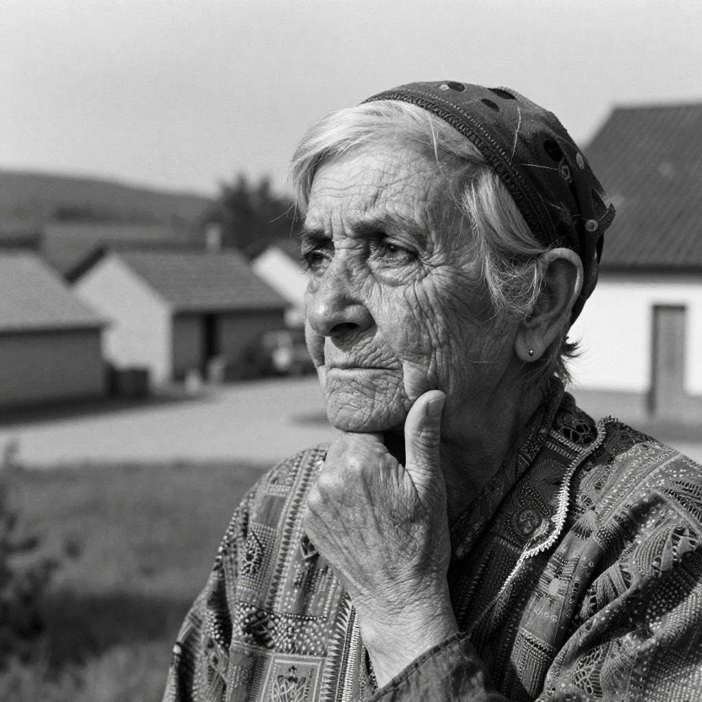 Realistic photo.Intense black-and-white photograph of a contemplative old woman, set against a quaint village background, shot by Helmut Newton and Diane Arbus, intricate texture, perfect details, film grain, analog photograph, shot on Phase One camera. realistic photo