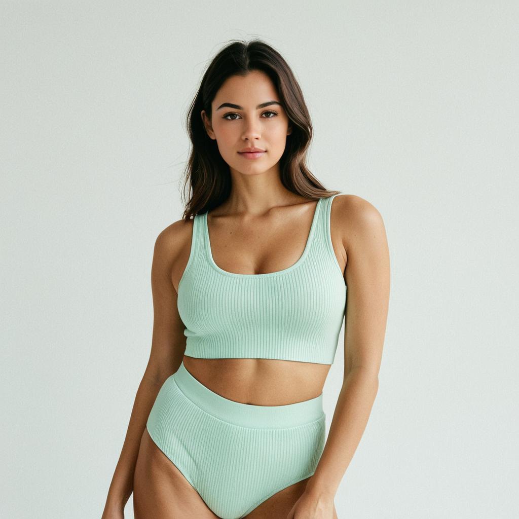 Woman, minimalist sporty, mint green ribbed knit sports bra, scoop neckline, racerback style, matching high-waisted bikini-cut briefs, simple design, white studio background.