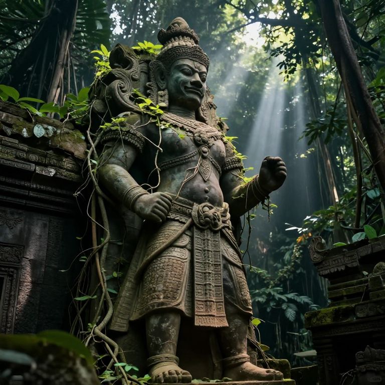 Photograph of an ancient, weathered stone statue of a muscular, armored Hindu deity in a lush, sunlit jungle temple, vines climbing around its