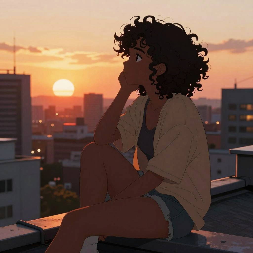 Black anime girl with curly hair sitting on a rooftop at sunset, looking thoughtfully over a bustling city, her curls glowing in the warm light, wearing casual modern clothes with a hint of fantasy elements, detailed urban environment, rich colors, anime-inspired illustration.
