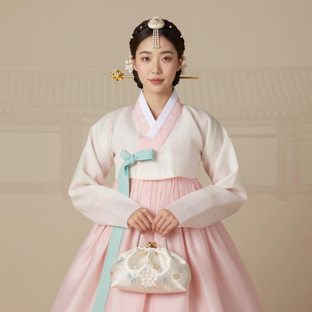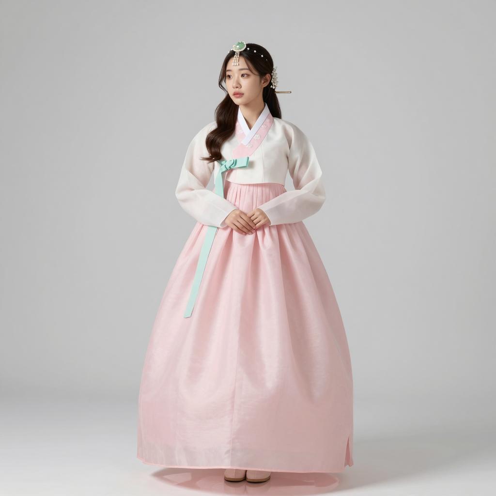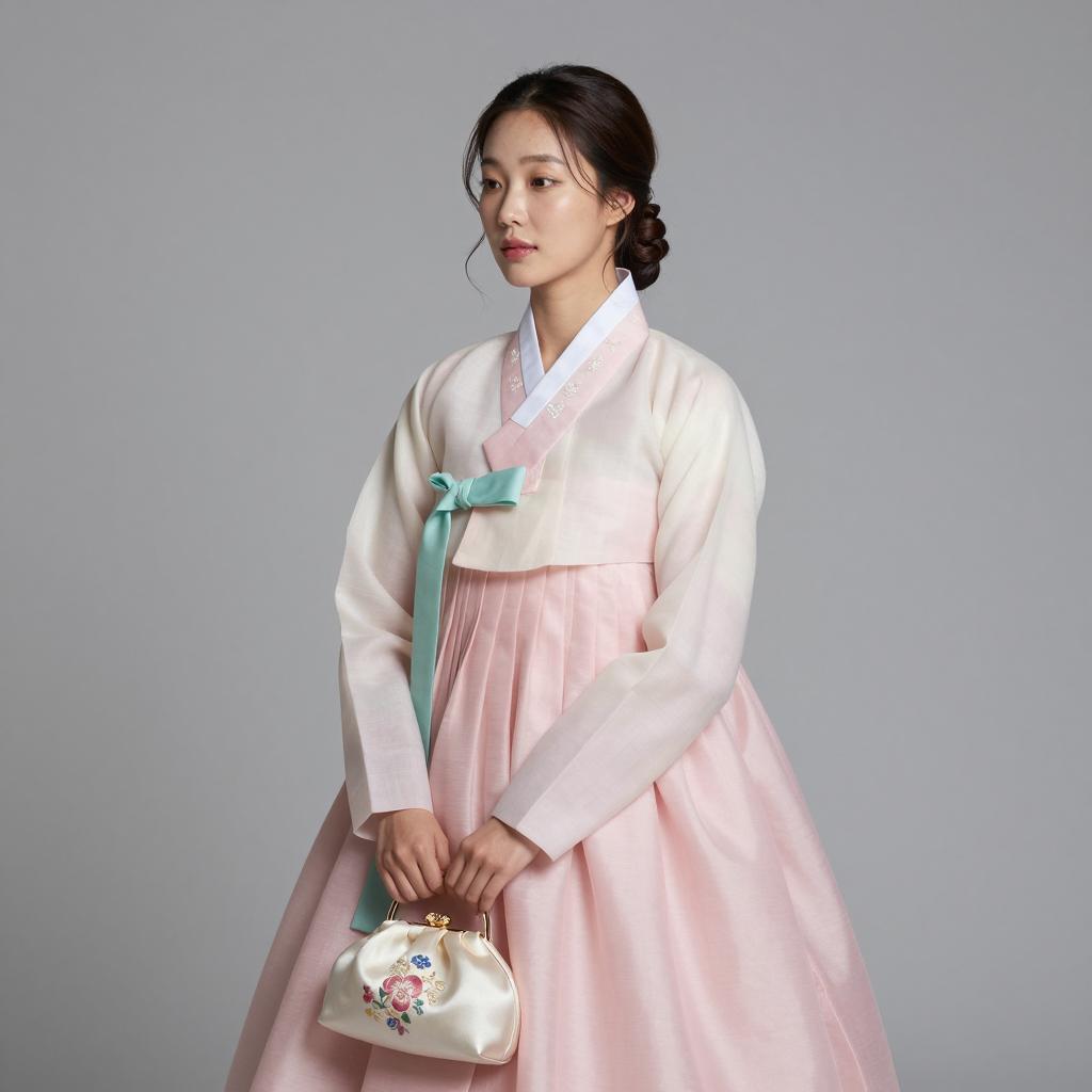Korean hanbok, full-body portrait of Korean woman with loose waves tucked behind one ear, serene look wearing soft pastel pink chima with ivory jeogori and mint green goreum (ribbon ties) with embroidered silk clutch bag held at her side standing in simple grey studio background with gentle spotlight on the subject, elegant traditional fashion photography, soft studio lighting, high resolution, ultra-detailed