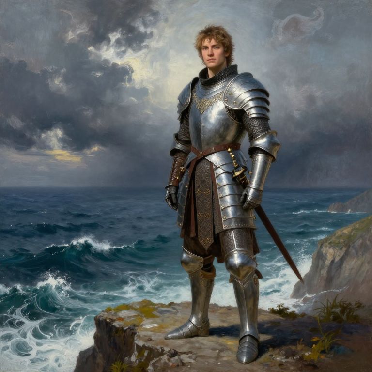 Digital painting of a blond, blue-eyed knight in shiny silver armor standing on a rocky cliff, holding a sword, with turbulent ocean waves and stormy