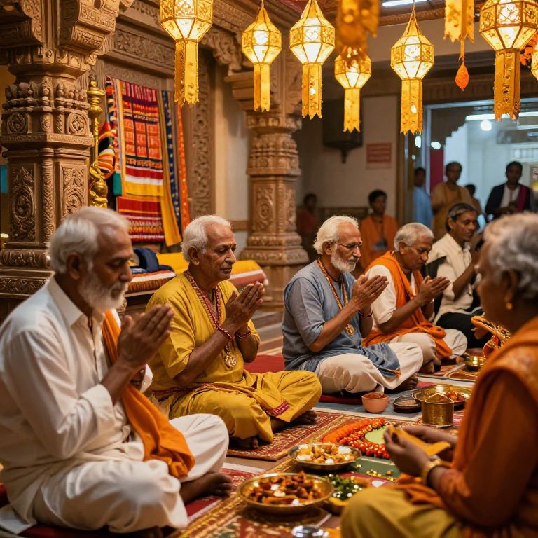 Hindu devotional prompts: A group of elders in a community temple chanting hymns during a festival, golden lanterns hanging above them, intricate carvings on walls, vibrant traditional textiles, joyful celebration, warm ambient lighting, documentary realism.