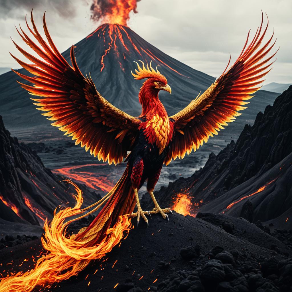 Illustration of a powerful dragon, featuring fiery red and smoky black, set in a volcanic mountain.