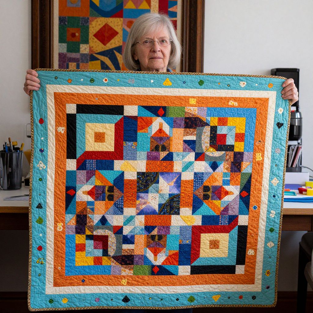 Woman Displaying Collaborative Quilted Masterpiece