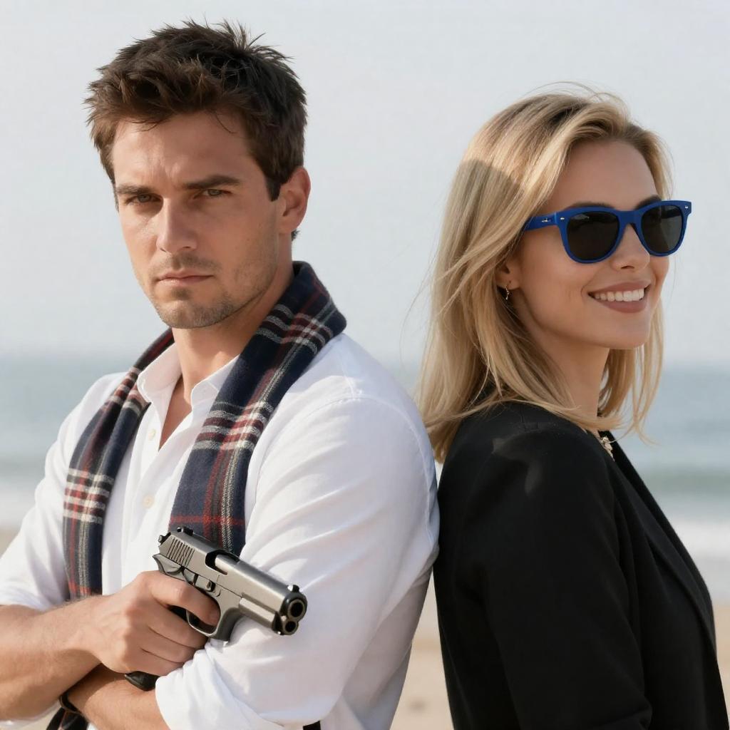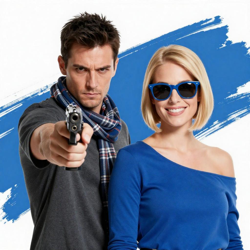 Photograph of a man and a woman. Man with short dark hair, white shirt, plaid jacket, pointing a gun forward, serious expression. Woman with blonde hair, blue sunglasses, smiling, white tank top, looking back. Bright blue and white background with abstract brush strokes.