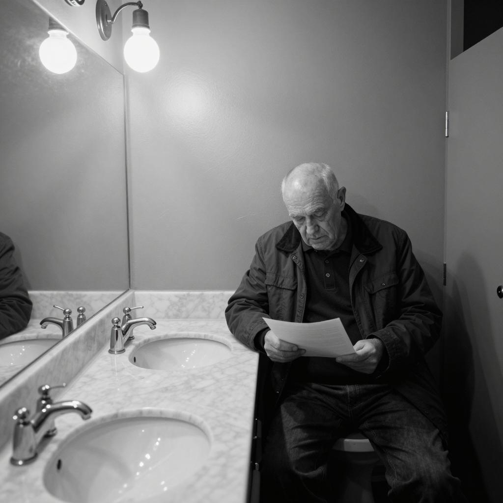 An elderly bald man with a shocked expression peeks through a translucent shower curtain. He is naked, holding the curtain with both hands. The background has white tiled walls, a green patterned wall section, a wall-mounted light fixture, and a towel rack with a white towel. The shower curtain is sheer, allowing visibility of his wet, pale skin. One visible wall outlet is to the right. The man's face is on the right side of the image, partially obscured by the curtain.