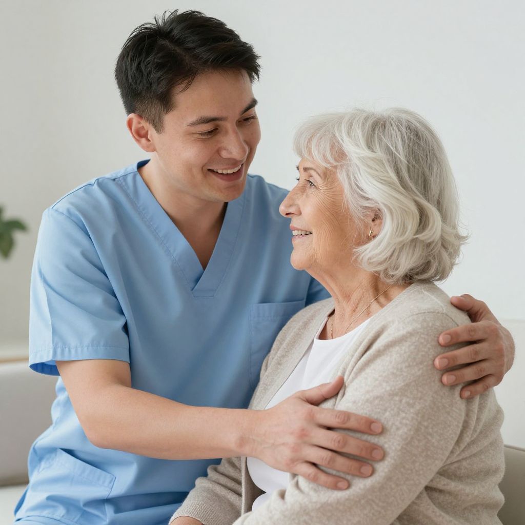 Caregiver in light blue scrubs embraces an elderly woman with short white hair, both sharing a warm smile in a softly lit indoor setting.