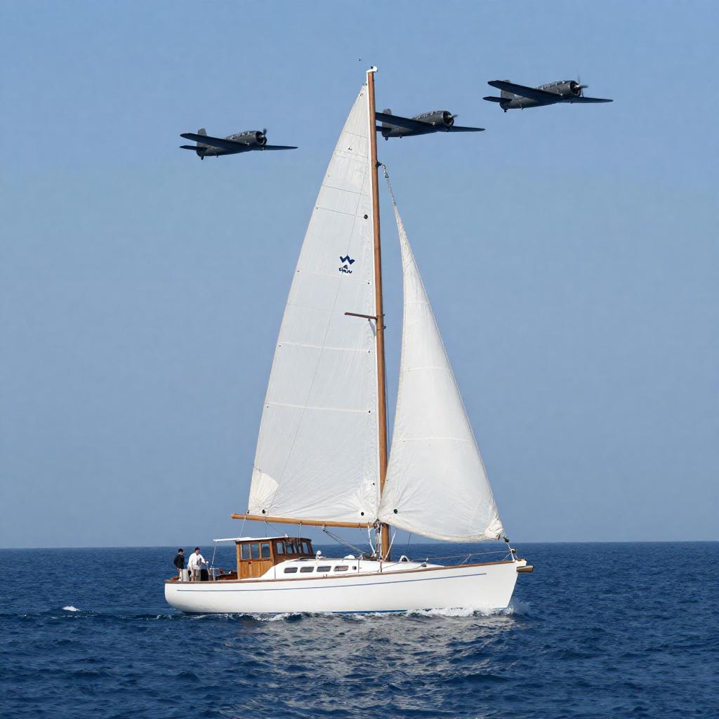 Photograph of a white sailboat named "Maritime" with a wooden cabin, sailing on blue ocean waters. Three black military planes fly in a V-formation above the boat against a clear sky. The boat's bow cuts through gentle waves, and a few people are visible on the deck.