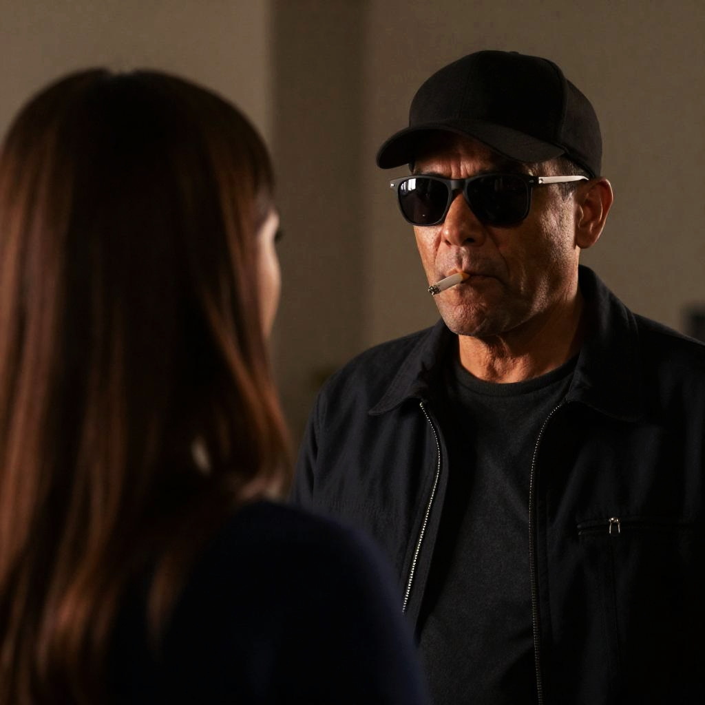Photograph of a middle-aged man with dark skin, wearing a black cap, sunglasses, and a dark jacket with a cigarette in his mouth. He stands facing a woman with long brown hair, seen from the back. Dimly lit indoor setting with blurred background. Man's expression is intense, focused on the woman.