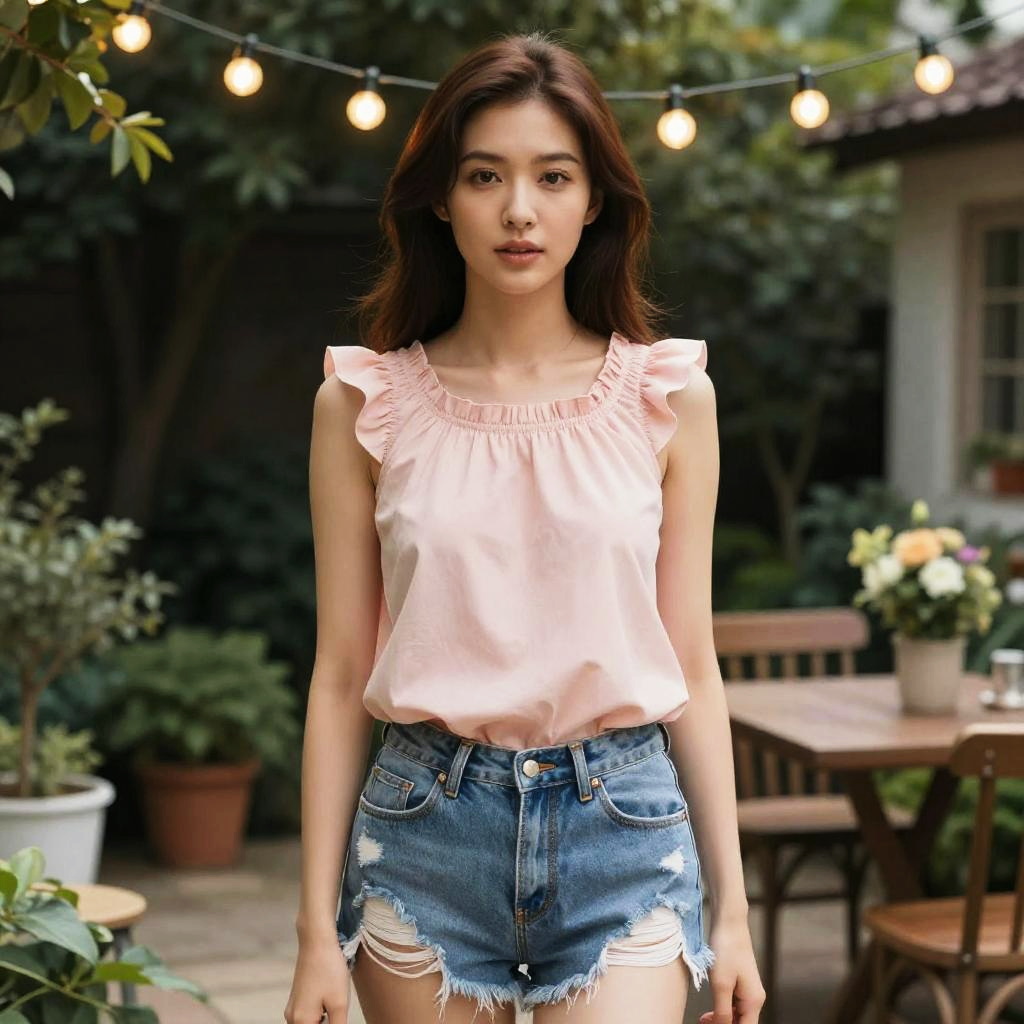 A hourglass woman in a casual chic style, wearing an orange ribbed tank top and fitted high-waist denim jeans, hoop earrings, and a sleek high ponytail, stands by a lush valley brook, inspired by the visual style of One Piece. Sexy. Pretty face and beutiful eyes