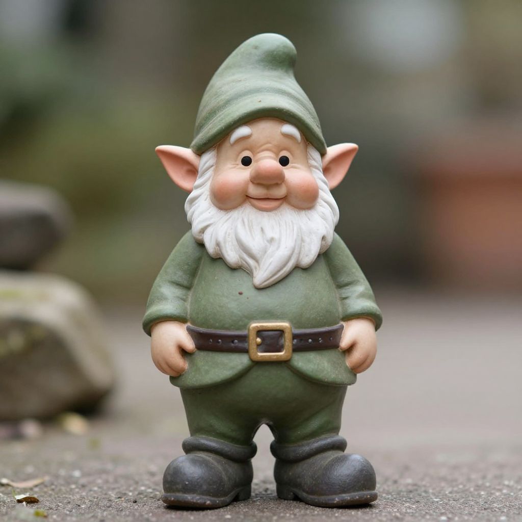 A full-body statue of a gentle hearted garden gnome standing outdoors on a stone surface. The gnome features pointy ears, a large white beard, rosy cheeks, and a soft smile. It is dressed in green clothing with matching pants and a tall pointed hat, a brown belt with a golden buckle, and black boots. The background is softly blurred, highlighting the gnome as the central focus of the image.