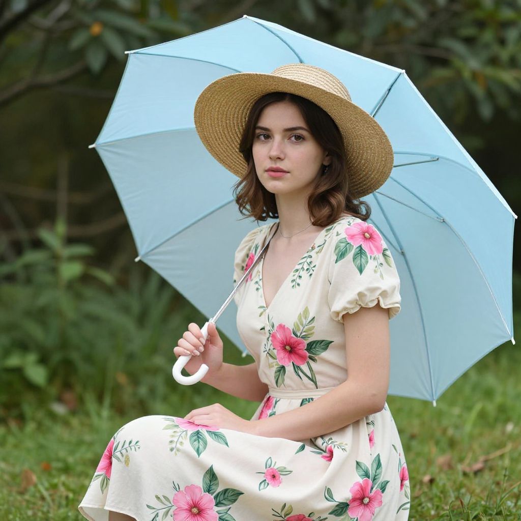 Stylishly poised, a young woman dons a wide-brimmed straw hat and holds a delicate parasol with light blue panels, complementing her cream-colored floral dress adorned with vibrant pink blooms and green leaves, as she sits gracefully amidst lush greenery.