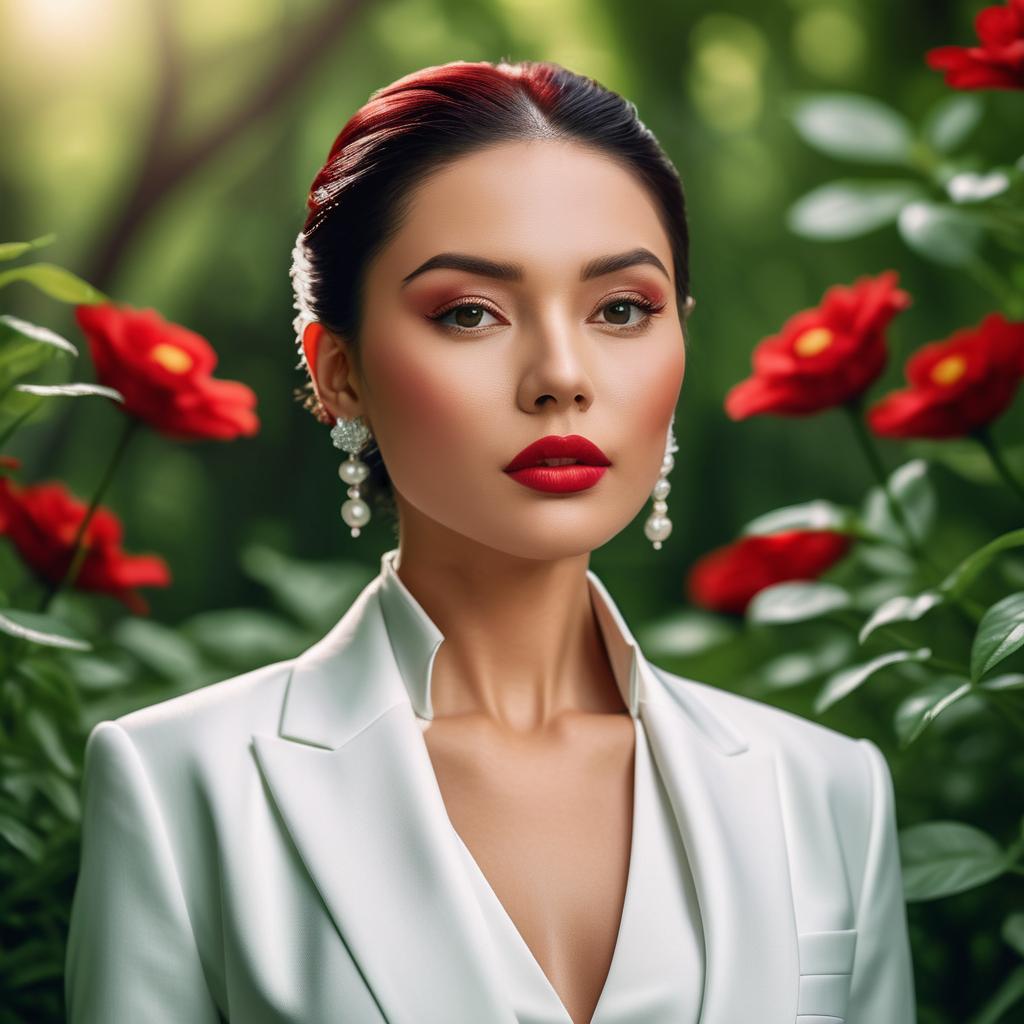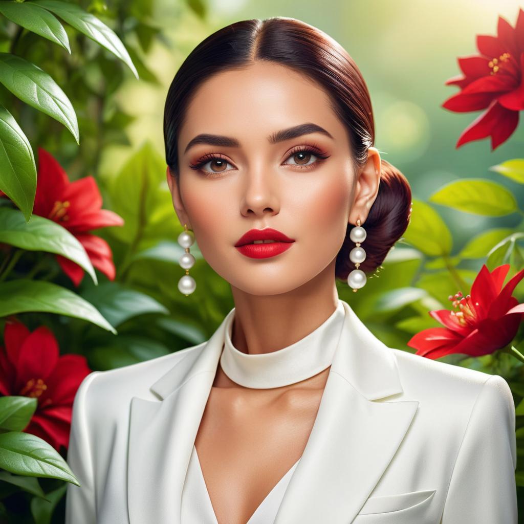 A sophisticated woman with smooth skin and a sleek hairstyle wearing a pristine white suit with a high-neck inner shirt, posing gracefully among lush green foliage and vibrant deep red flowers, natural soft lighting highlighting her elegant makeup with bright red lipstick and pearl earrings, detailed texture, high contrast between white clothing and red-green natural background