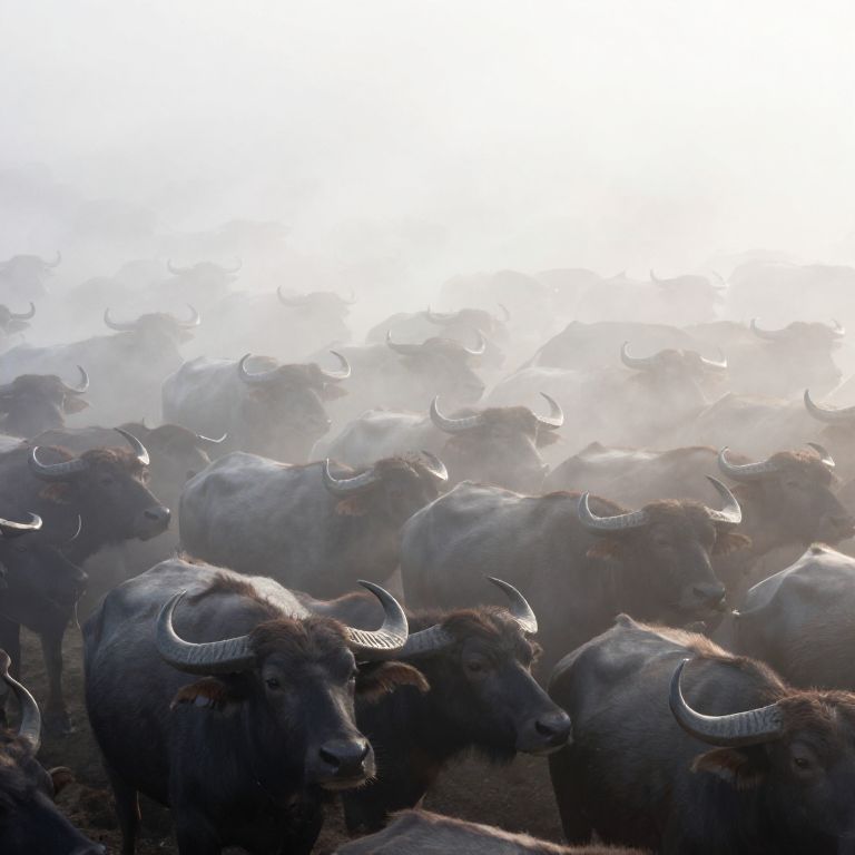 Photograph of a chaotic herd of dark-colored buffalo surrounded by thick, white mist. The buffalo are tightly packed, with horns and muscular bodies visible through the fog. The image has a dramatic, almost ethereal quality, with the mist adding a sense of movement and urgency. The background is mostly obscured, emphasizing the dense cluster of buffalo in the foreground.