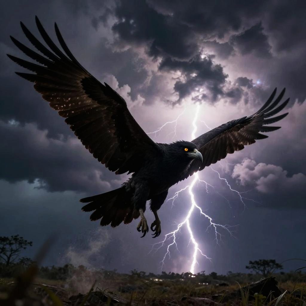 Photograph of a black eagle with outstretched wings flying against a stormy sky with bright lightning and dark clouds.