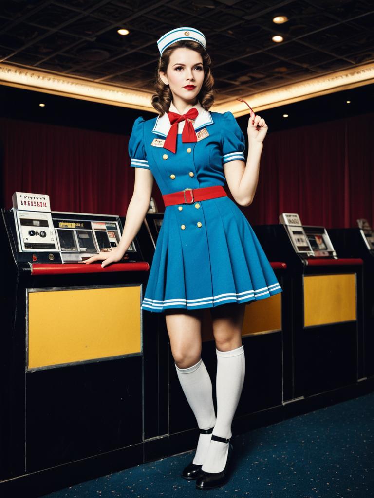 Woman in Cinema Usherette Costume, full-body cosplay photo with retro uniform
